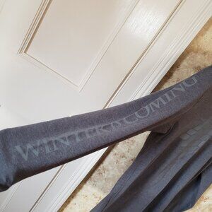 Game of Thrones "Winter Is Coming" House Stark graphic longsleeve shirt. The shirt is grey and the graphic is a slightly lighter grey so it's a more subtle graphic. The front features the dire wolf house symbol graphic and the right sleeve has "Winter is coming" down the arm.