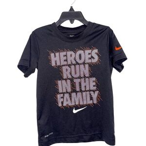 Stylish black Nike t-shirt for kids. Features bold white text and orange logo. Comfortable and sporty design.
