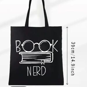 This black canvas tote bag features a minimalist 'Book Nerd' design with glasses and books in white graphics. Made from sturdy canvas, it's a stylish accessory for book lovers.
