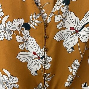 Chic mustard top with floral print. Features tie-front detail. Long sleeves for elegant look.