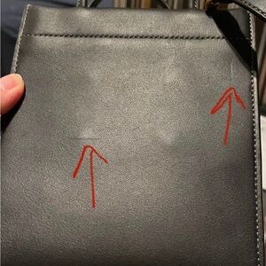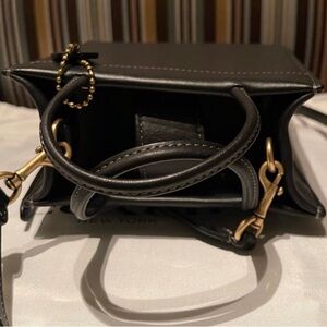 This elegant Black Glovetanned leather, Coach Cashin mini tote is perfect for any occasion. Its sleek design and high-quality material make it a must-have accessory. Comes with original dust bag and hashtag. It’s ideal for both casual and formal settings. Overall condition is very good. The tote does have some markings on both sides, shown in pictures. Pictures are magnified and these normal wear markings aren’t visible, unless you are looking for them under bright light. Comes with removable crossbody strap.
