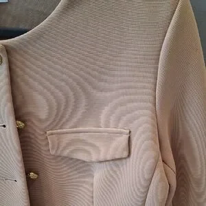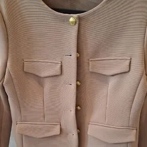 Chic camel blazer with gold button accents. Features flap pockets and a tailored fit. Perfect for versatile styling. Gorgeous fully lined jacket!!