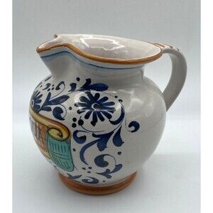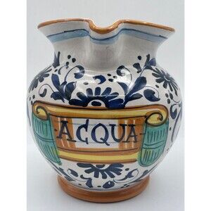 Ricco Deruta Italy Pitcher Hand Painted "ACQUA" Colorful Floral Scroll 6”