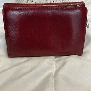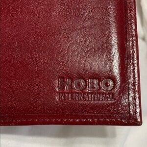 Elegant red leather wallet. Embossed HOBO logo. Sleek and stylish design.