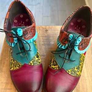 Crazycatz handmade leather oxford style shoes. Lace up with a mix of teal, burgundy, and yellow, these shoes are perfect for adding a pop of color to any outfit.