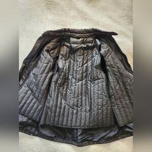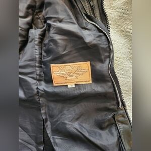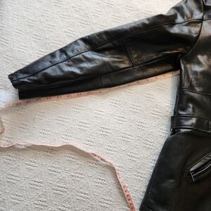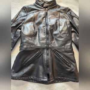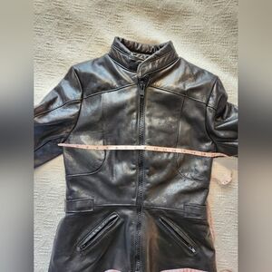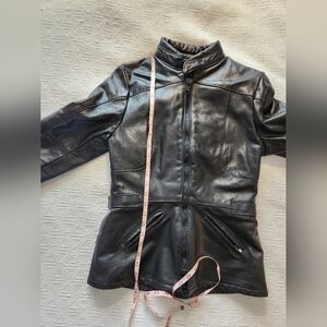 Women's black leather Falcon motorcycle jacket. Size 10 - sizing is very small (see measurements - likely an xs). Has a removable liner vest inside. In great condition.