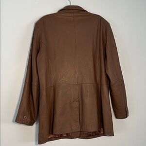 Smooth chocolate brown leather blazer jacket with single button and two front pockets. Satin lining. Great vintage condition.