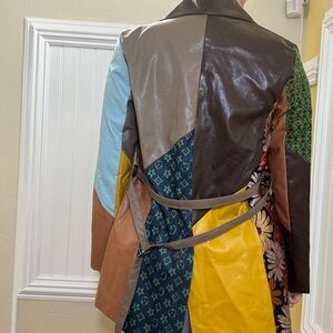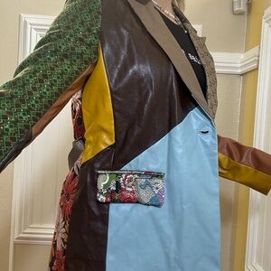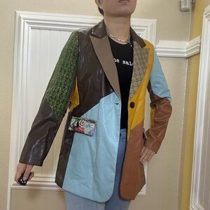 Stand out with this vibrant patchwork jacket featuring a mix of brown, blue, and yellow hues. Perfect for adding a pop of color to any outfit.