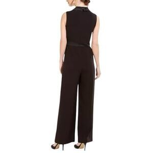 Chic, timeless, and polished — this Vince Camuto tuxedo-style jumpsuit is the perfect blend of elegance and modern edge. The sleeveless design features a satin shawl collar, matching satin waistband, and a gold-tone button accent for a refined finish. Wide-leg silhouette creates a flattering, elongated look.