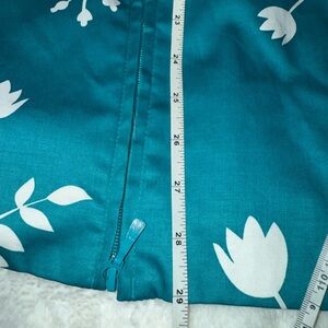 Stylish teal jacket with white floral pattern. Perfect for any occasion. Comfortable and chic.