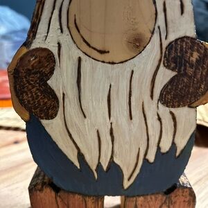 Bring charm to your home with this handcrafted wooden wood burned and painted holiday gnome. Featuring a delightful green hat, this piece adds a whimsical touch to your decor.