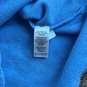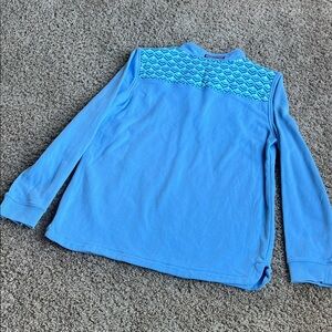 Light blue pullover with unique patterned shoulder accents. Features a half-zip front.