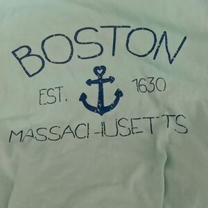 Women's size Medium light blue 100% cotton Boston souvenir graphic t-shirt by Delta Pro Weight. cracking in lettering as shown. 18.5" pit to pit. casual natural fiber comfort lightweight beach fishing boating travel camping anchor nautical hiking workout exercise warm-up leisure lounging