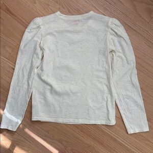 Off white with silver sparkles. Features adorable puffed shoulders!