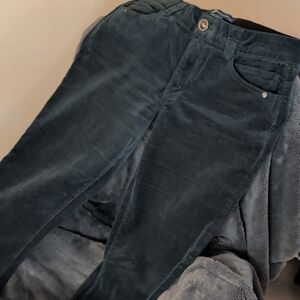 Earthy toned dark pine green straight leg corduroy pairs well with tones brown, beige and cream. Corduroy has a vintage, retro feel. Casual, smart-casual. Rugged and outdoorsy aesthetic. Gorpcore.