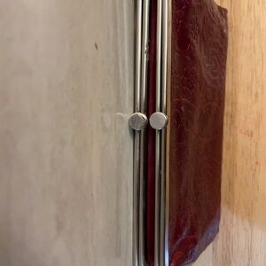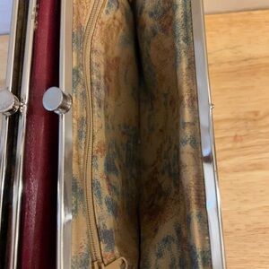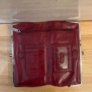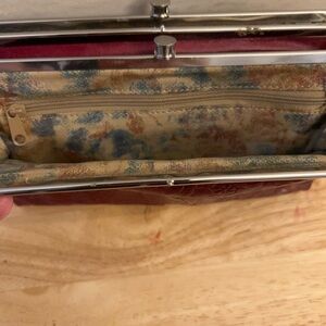 Hobo Lauren clutch wallet in a burgundy, tooled leather with a kiss-lock clasp.