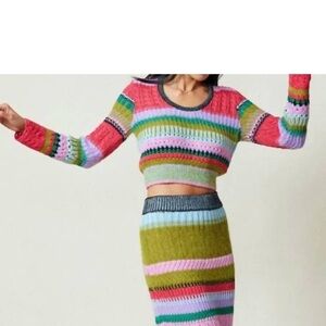 This scoop neck top is meticulously crafted in a fair trade factory in Peru, which actively empowers and employs talented local artisans. It showcases exquisite hand-crocheted accents at the hem, adding an artisanal touch. The top seamlessly combines an array of knit textures and colors, creating a captivating and playful piece. Pair this slightly cropped top with your favorite blue jeans or our matching Ashby Skirt - both get their names from Lingua Franca’s marketing associate Lauren "Ashby" who wears this set beautifully.