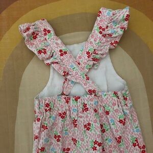 Children's Vintage pink and red floral print corduroy overalls with ruffle straps by HealthTex. These overalls unsnap along the bottom and un button on the straps. They are marked size 24 months, please see measurements below: