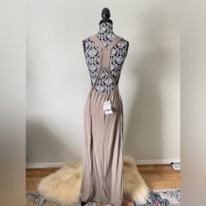ZARA NWT Boho Beachy Backless Maxi Dress S Taupe Tassel Fringe Detail Minimalist