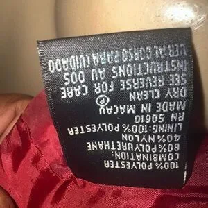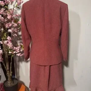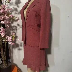 Chic red blazer with matching skirt. Single-button closure. Perfect for professional settings.