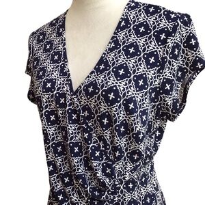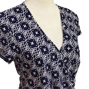 This is a blue geometric wrap maxi dress by Laundry by Shelli Segal in size medium for women. It features a V-neck, short sleeves, and a collarless design. Made from a blend of polyester and spandex knit fabric, this dress is machine washable and has a stretch feature. It is suitable for various occasions like travel, casual wear, parties, and holy communion, making it a versatile and stylish addition to any wardrobe.