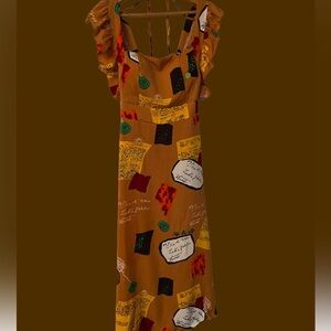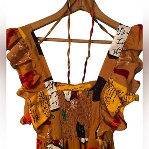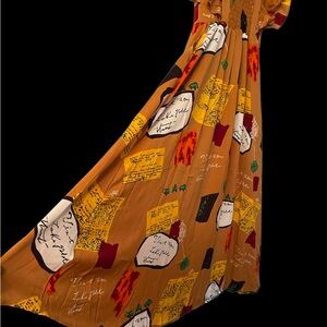 This maxi dress is very unique. It looks to be possible love letters or letters of travel of some sort. There are no tags at all on this dress. At best guess it’s a polyester with some stretch. Then you have the back with the elastic stretch that goes across the back. Padded chest. Can be worn off or on shoulders. 12.5 pit to pit 45in from top to bottom hem.