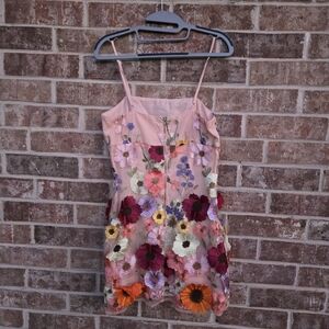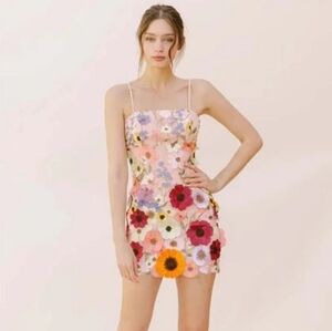 The Storia multi-floral collaged mini dress features a fitted bodycon silhouette with 3D flowers.