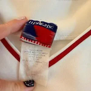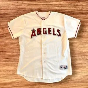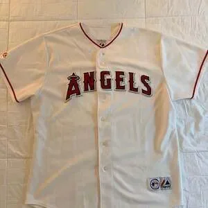 Authentic Majestic MLB Los Angeles Angels white baseball jersey in men's size L. This jersey features the classic Angels text across the chest in red with a silver outline, making it clear you're a fan. Made from 100% polyester, it's designed for comfort and durability. The jersey is in excellent, pre-owned condition, perfect for game day or casual wear. Show your team pride with this genuine MLB licensed merchandise.