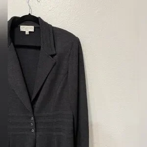 Jacket features: 3-button closure, structured collar, waist seaming, 3/4 sleeves, long tunic length