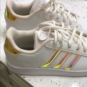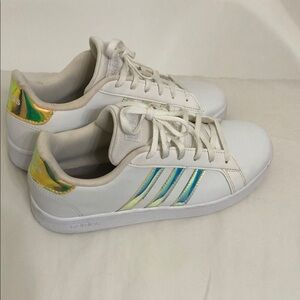 Chic adidas sneakers. White with eye-catching iridescent details. Perfect for everyday wear. Very clean.