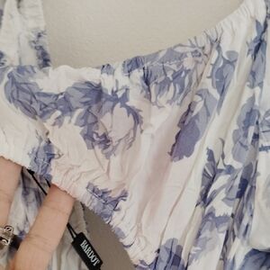 Chic backless dress with floral design. Features puff sleeves. Perfect for stylish outings.