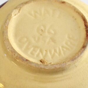 By Watt Ovenware, mixing bowl with apple design. There are 2 small chips on the apple leaves, and a manufacturing chip on the bottom.