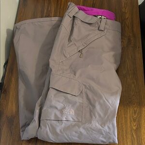 Ski/snowboard pants for women by North Face. Size XL, deep mauve color. Side zip pockets and leg cargo pocket.