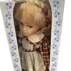 Vintage 1990s Memories Porcelain Doll Collectible. Comes with stand. Posable arms and legs. 11 inches. Still in box. Blonde hair and blue eyes.