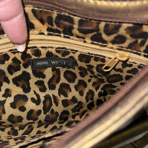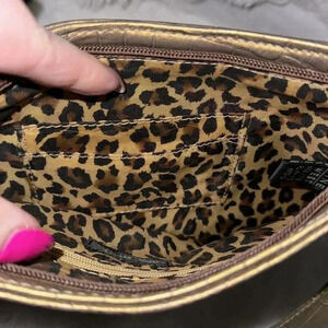 Vintage Nine West faux crocodile vegan leather gold metallic purse. A beautiful golden almost iridescent color with leopard cheetah print interior. Magnetic closure front pocket & interior zip pocket, and a small pocket for a credit card/ID. Excellent condition with the only issue being very slight wear to the top of the strap as seen in photo. Not noticeable unless you thoroughly exam close up.