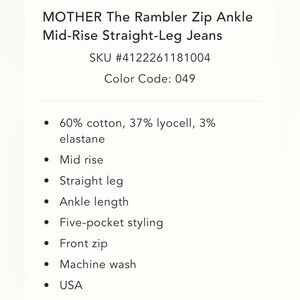 MOTHER The Rambler Zip Ankle Mid-Rise Straight-Leg Jeans NWT