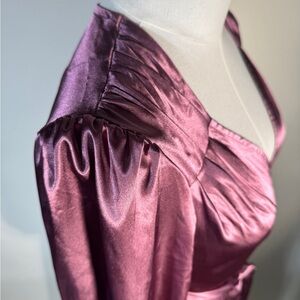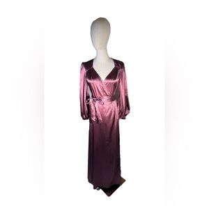 This elegant satin wrap dress features a stunning mauve color, perfect for any special occasion. The luxurious fabric and flattering design make it a must-have addition to your wardrobe. Statement sleeves!!