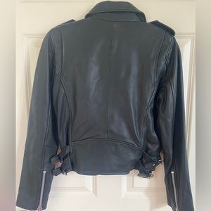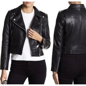 New with tags, Walter Baker leather Moto jacket. Classic black with silver tone hardware. Zip side pockets & tons of detail. 2 extra front pockets. Double waist buckles. Zips at sleeve cuffs. Lamb leather with satin lining. Size small Armpit to armpit 17.5”. Neck/collar to bottom, 21.5”. Perfect condition. Retailed for $698.00