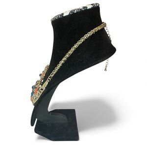 This is a gold-tone statement bib necklace with orange and teal rhinestones