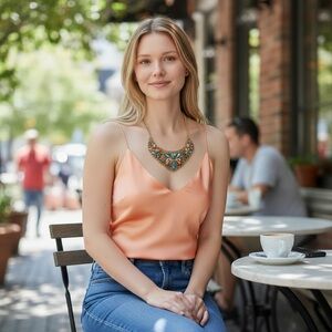 Make a bold statement with this elegant gold and orange necklace. Perfect for adding a touch of glamour to any outfit.