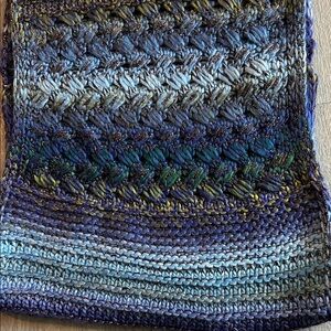 Elegant Echo scarf with rich blue and green hues. Perfect for cozy style.