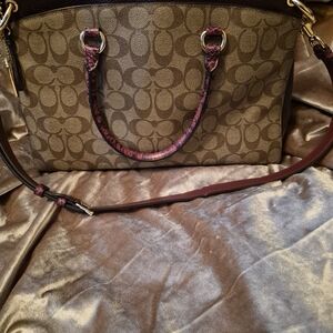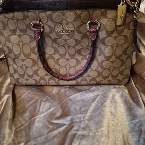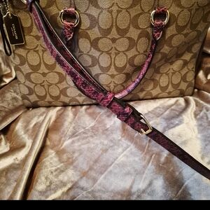 Elevate your style with the Coach Signature Tote Bag. Featuring a classic brown design with purple accents, this bag is perfect for any occasion. Enjoy the luxury and functionality of Coach.
