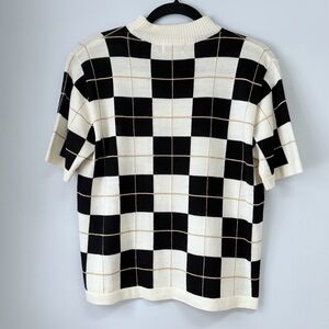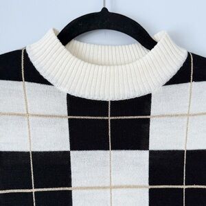 Vintage Jacobson’s Petite Ivory & Black plaid short sleeve sweater with metallic gold accents. Great retro preppy vibes.