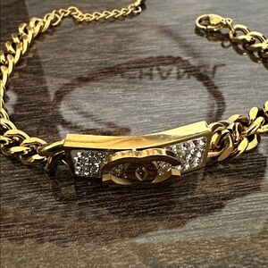 A gold-tone Chanel bracelet featuring a crystal-encrusted CC logo plaque on a curb link chain