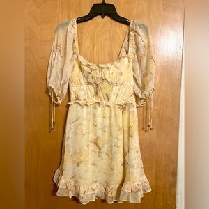 Chic mini dress with floral design. Features puff sleeves and ruffle hem. Perfect for a stylish outing.