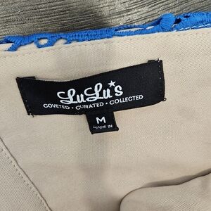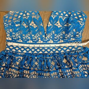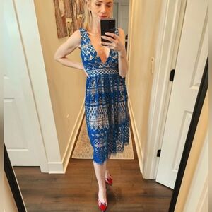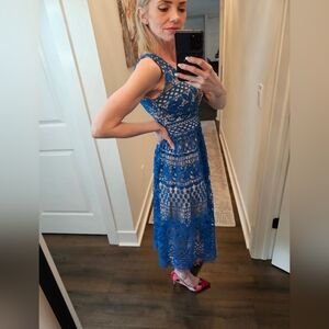 Previously loved dress with a floral lace bodice, with beige lining, flows from a V-neck and back. Flaring midi skirt completes the silhouette with sheer lace at the hem. Exposed silver back zipper with hook&eye clasp.