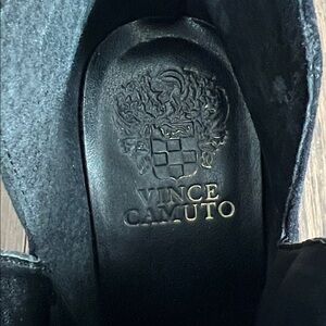 These stylish ankle boots feature black suede on the front with a pointed toe and a contrasting leopard print calf hair panel on the back heel counter, gold zipper back closure, and a cushioned footbed for comfort.