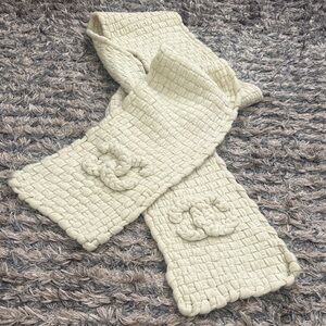 Luxurious cream scarf with textured design. Features iconic CHANEL logo. Perfect for chic elegance.