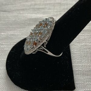 This ring features light blue topaz marquise and oval citrine. The citrines are in the middle of the blue topaz. There are clear white sapphires along the border.