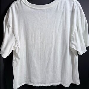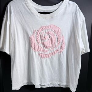 Woman’s top featuring a delicate pink rose embroidery on a soft white fabric. Perfect for casual outings.